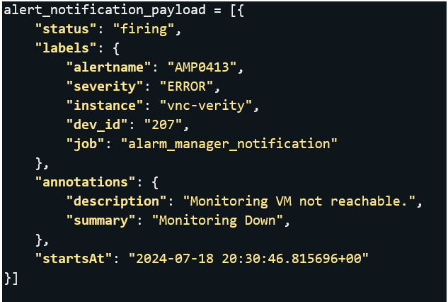 When an alarm is triggered an alert notification payload is sent to the Alert Manager. Below is an example of what the alert notification payload contains. This information is used in the notifications sent out by the Alert Manager, which will be explained in more detail later.