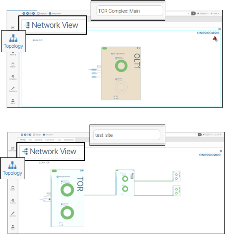 The content presented by clicking the System Graphs, Topology, Alarms and Reports navigation menus will update to reflect the configuration of the currently selected site.