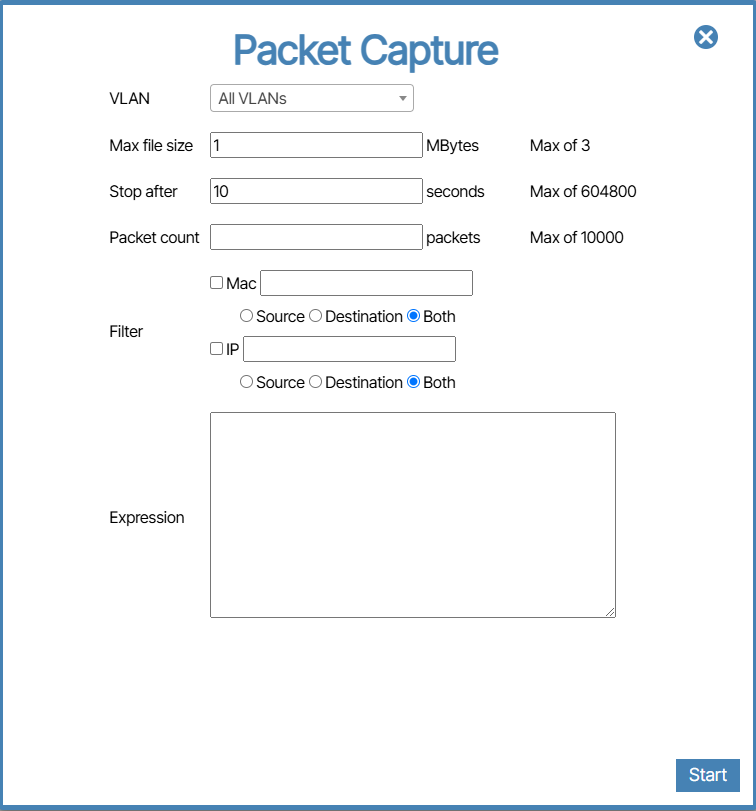 . A form field will appear. To begin the packet capture fill out the field and press the Start button.