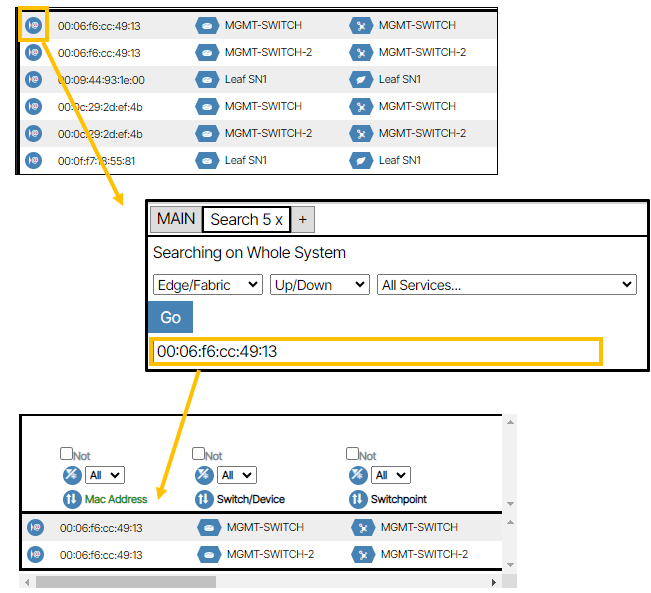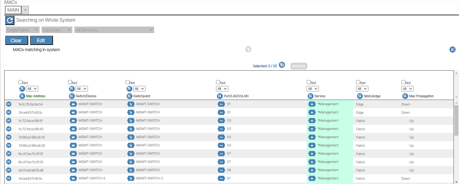 The Mac Address Workbench lets you search device by mac address. Clicking the Search button without specifying a mac address displays all devices