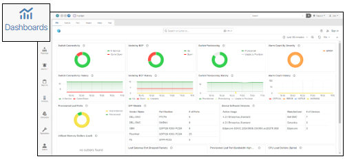 The Dashboards navigation panel presents a collection of networking monitoring tools used to track system-wide information, such as Service Port activity, virtual machine performance statistics, provisioning information, and more.