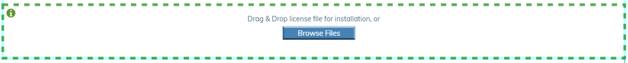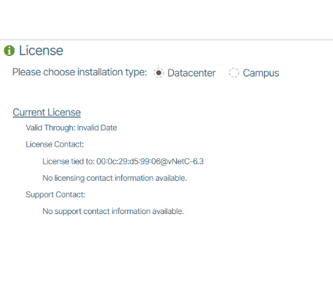 - After you obtain your license.cms file you are required to upload it to the application. In the License window select data center or campus (depending on your system). Use the drag and drop palette to upload the file or browse for the file. The license file may also be embedded in a \<filename>.tar file and this can also be directly imported and the system will extract the license.cms file.