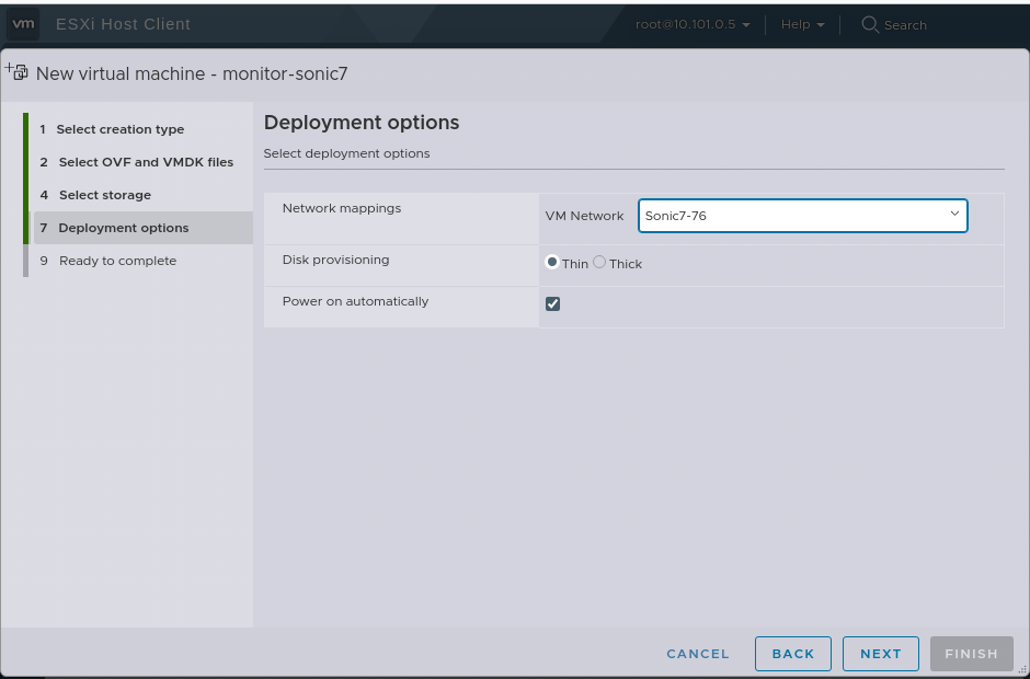- Set the Deployment options and network mappings to the correct Port Group.