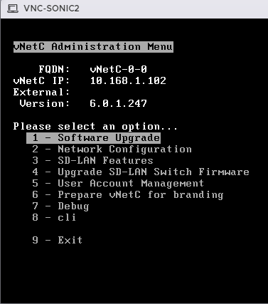 - At the login prompt enter username admin and the administration password configured in the menu during installation. These are the credentials you entered in step 3 of Configure the vNetC from the Console.