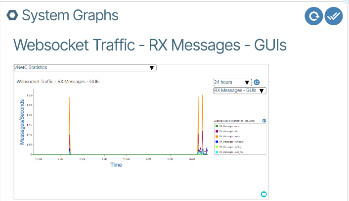 The System Graphs display system wide information such as Service Port activity and virtual machine performance statistics on the UI. Graph types, subtypes and time ranges can be changed at any time. The user saves by clicking on the double check mark icon in the top right. The graph selections are saved per user. There are many System Graphs. Below are a few select examples of this feature. To access graphs click the System Graphs (