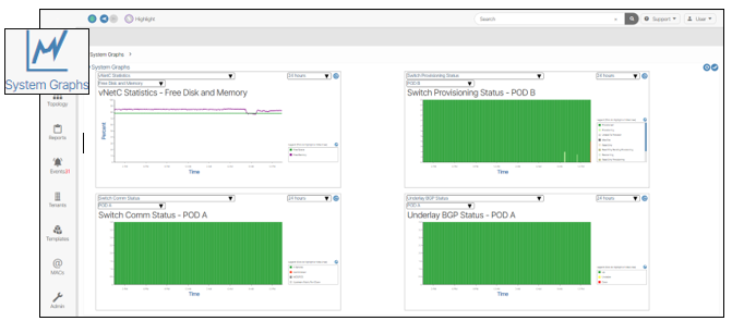 The System Graphs navigation panel is only available to systems that do not have the Monitoring VM installed. For systems with the Monitoring VM enabled, the System Graphs navigation panel is replaced by the Dashboards navigation panel.